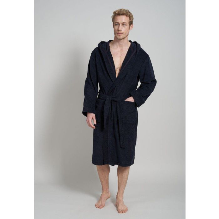 Donkerblauwe badjas van heerlijk zachte badstof van 100% katoen.