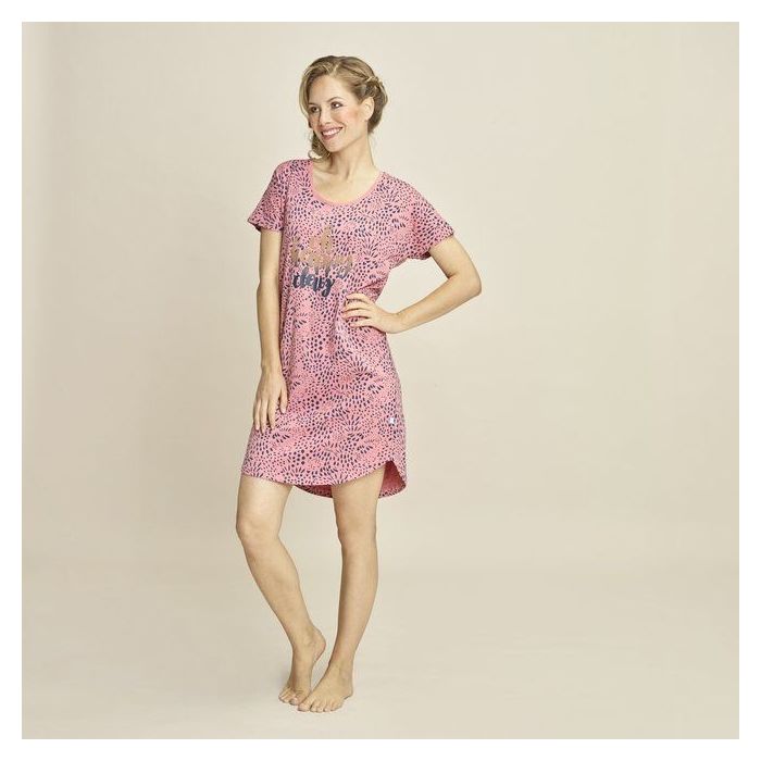 Het is een fijn wijdvallend nachthemd in oud roze met een navy all-over print