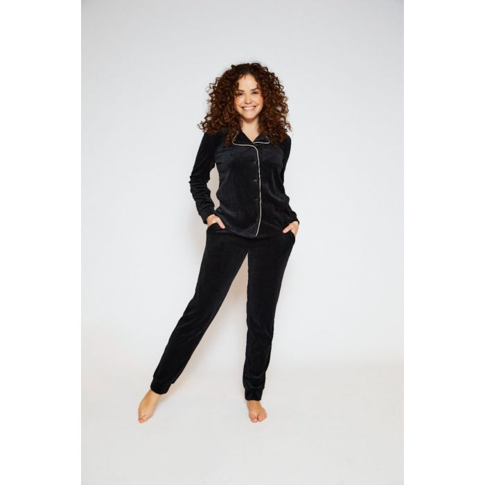 De Charlie Choe dames pyjama set met knoopsluiting in de kleur zwart heeft een off white bies en is samen met de broek van mooie zachte velours. Een heerlijke set voor de koude dagen.