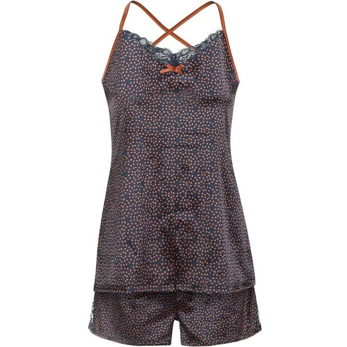 Deze mooie shortama heeft een cognac kleurige blokjes print. Leuk detail zijn de dubbele spaghetti schouderbandjes en het satijnen lint aan de short in cognac kleur.