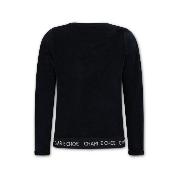 Het Charlie Choe pyjama shirt Fantasy Dreams is van een zachte zwarte velours met een elastieken band onderaan de sweater met de tekst Charlie Choe erop.