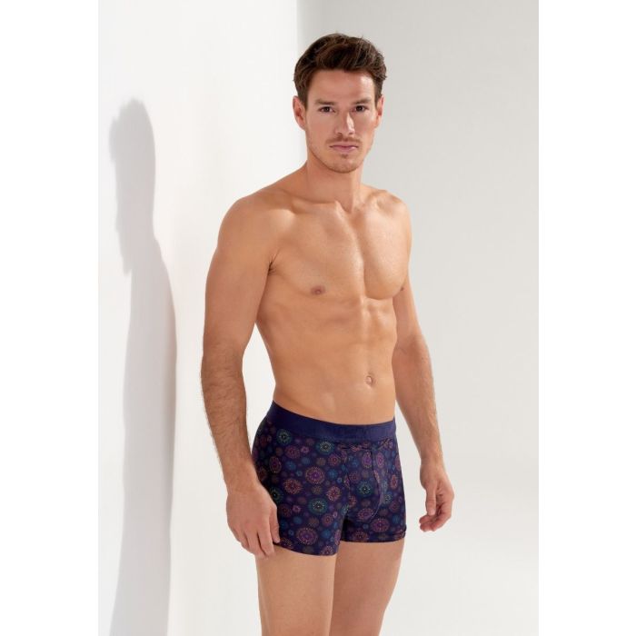 De HOM HO1 Spectra Boxer brief is een unieke en stijlvolle keuze voor mannen die zowel comfort als een feestelijke uitstraling zoeken. De combinatie van de vuurwerkprint en de middernachtblauwe achtergrond geeft de boxer een levendige, maar toch elegante uitstraling. De horizontale opening is een fijn detail voor extra comfort en gemak, en de elastische heupband met het subtiele HOM-logo zorgt voor een premium uitstraling.