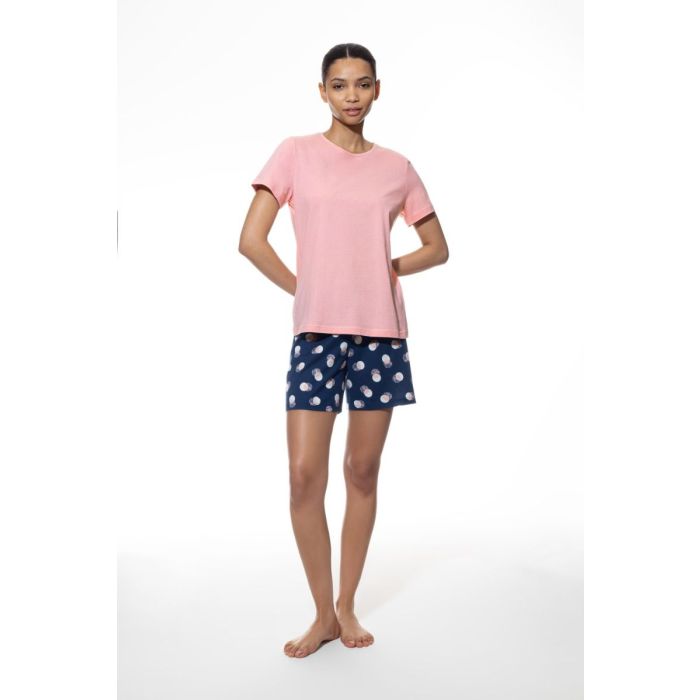 De korte pyjama in de kleur Deep Marine is een absolute wardrobe-essential. Het eenkleurige shirt maakt indruk met zijn ronde hals en korte mouwen, terwijl de korte broek versierd is met een speelse stippenprint. Dankzij de materiaaleigenschappen van 100% single-jersey is de pyjama erg ademend en huidvriendelijk.