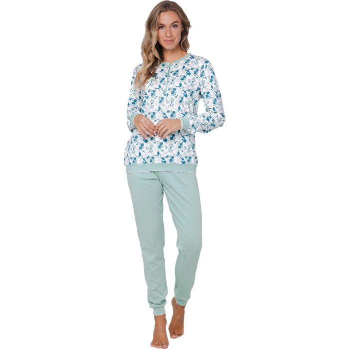 Deze warme pyjama van Pastunette is perfect voor koude winternachten. Het pyjamashirt heeft lange mouwen, een ronde hals met knoopsluiting en is afgewerkt met boorden aan de mouwen en onderzijde. De lichtgroene accenten met een smalle witte lijn geven de set een frisse uitstraling. De witte stof is bedrukt met een sierlijke bloemenprint in petrol, lichtgroen en lichtgrijs. De bijpassende lange broek is effen lichtgroen met boorden aan de pijpuiteinden, ook afgewerkt met een witte lijn. Gemaakt van 100% katoen interlock: extra zacht, warm en comfortabel.