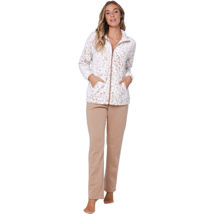 Dit duurzame en warme huispak van Pastunette is ideaal voor ontspannen momenten tijdens koude dagen. Het fleece vest heeft lange mouwen, een hoog opritsbare kraag, een ritssluiting en handige zakken. De zachte stof is uitgevoerd in een subtiele beige panterprint op een witte achtergrond, wat zorgt voor een stijlvolle en cosy uitstraling. De bijpassende lange broek is effen beige en gemaakt van comfortabele badstof. Beide materialen zijn deels vervaardigd uit gerecyclede stoffen – een verantwoorde keuze met extra warmte en zachtheid.