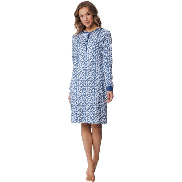 Dit mooie nachthemd komt uit de collectie van Pastunette. Het nachthemd is ecru van kleur met een all-over dessin van kleine blaadjes in het blauw en lichtblauw. Het nachthemd heeft lange mouwen en een ronde hals met een knoopsluiting. De hals en de boordjes aan de mouwen zijn afgewerkt in de kleur blauw. Het nachthemd is gemaakt van 100% katoen interlock. Het materiaal voelt heerlijk zacht en comfortabel aan op de huid. Het is dan ook geliefd bij veel mensen vanwege het knusse-gevoel. Daarnaast houdt het warmte goed vast, waardoor het ideaal is voor koudere seizoenen. Verder heeft katoen een ademend vermogen en is het gemakkelijk in onderhoud. Het nachthemd heeft een lengte van 100 cm in maat 38. Het model is 178 cm lang en draagt maat 38.