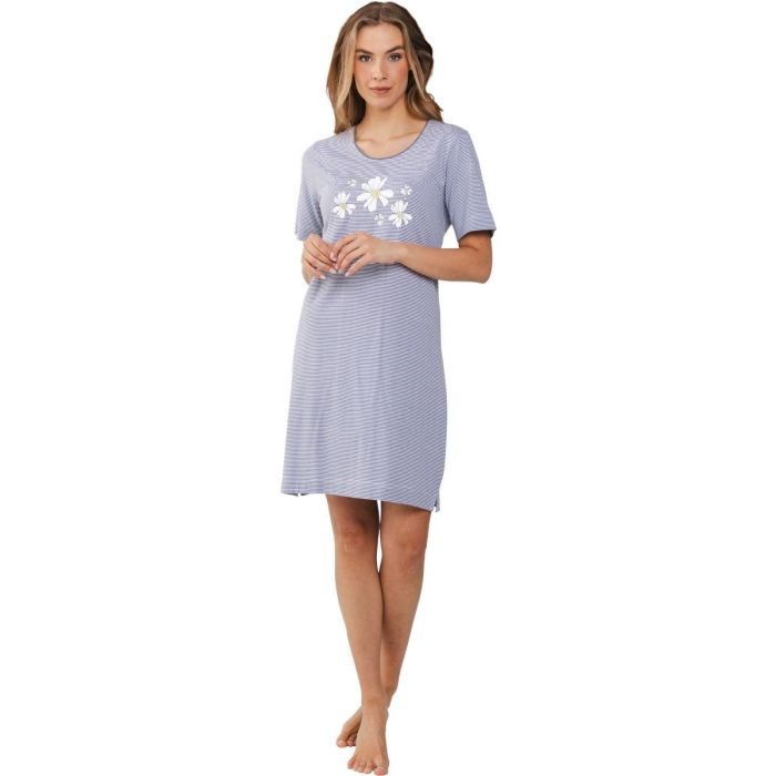 - Het nachthemd heeft korte mouwen en een ronde hals.