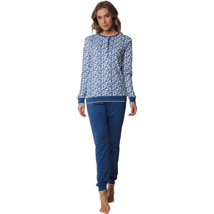 Deze mooie pyjamaset komt uit de collectie van Pastunette. De pyjamaset is tweedelig en bestaat uit een top en een lange broek. De top is ecru van kleur met een all-over dessin van kleine blaadjes in het blauw en lichtblauw. De top heeft lange mouwen en een ronde hals met een knoopsluiting. De hals en de boordjes aan de mouwen zijn afgewerkt in de kleur blauw. De uni blauwe broek heeft een elastische tailleband en boordjes. De pyjamaset is gemaakt van 100% katoen interlock. Het materiaal voelt heerlijk zacht en comfortabel aan op de huid. Het is dan ook geliefd bij veel mensen vanwege het knusse-gevoel. Daarnaast houdt het warmte goed vast, waardoor het ideaal is voor koudere seizoenen. Verder heeft katoen een ademend vermogen en is het gemakkelijk in onderhoud. Het model is 178 cm lang en draagt maat 38.