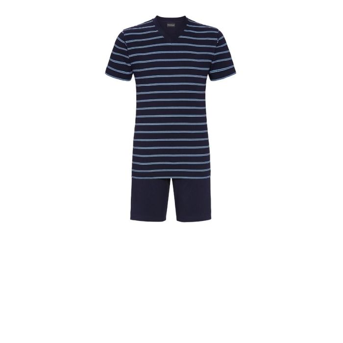 Deze heren shortama van Ringella is zowel stijlvol als comfortabel! Het shirt heeft een V-hals en korte mouwen, met een leuk lichtblauw strepenpatroon op de donker blauwe achtergrond, wat het een frisse uitstraling geeft. De effen donker blauwe korte broek maakt het geheel netjes en veelzijdig. De stof voelt glad en zijdezacht aan, wat zorgt voor extra comfort.