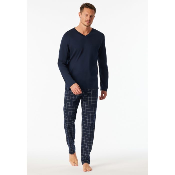 lange, nachtblauwe heren pyjama met effen Bovenstuk en geruite broek, uit de SCHIESSER-serie "Fine Interlock, Shirt met lange mouwen, omboorde v-hals en borstzak, effen broek met comfortabele tailleband, onze modellen dragen maat [50/M], van hoogwaardige kwaliteit, zachte, fijne kwaliteit