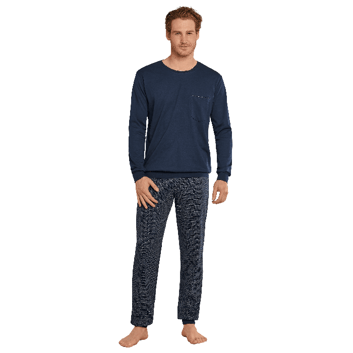 Bij deze pyjama met lange broek voor heren staat het hoge draagcomfort centraal. Dankzij 100% fijn gebreid katoen en boordjes aan de armen en zoom is hij bijzonder comfortabel. Ook de kleur van deze tweedelige set mag ook gezien worden. Het donkerblauwe shirt met lange mouwen en ronde hals en borstzakje wordt perfect aangevuld met een broek in beige-blauw patroon. Precies goed voor ontspannen nachten in de uitstekende SCHIESSER-kwaliteit!