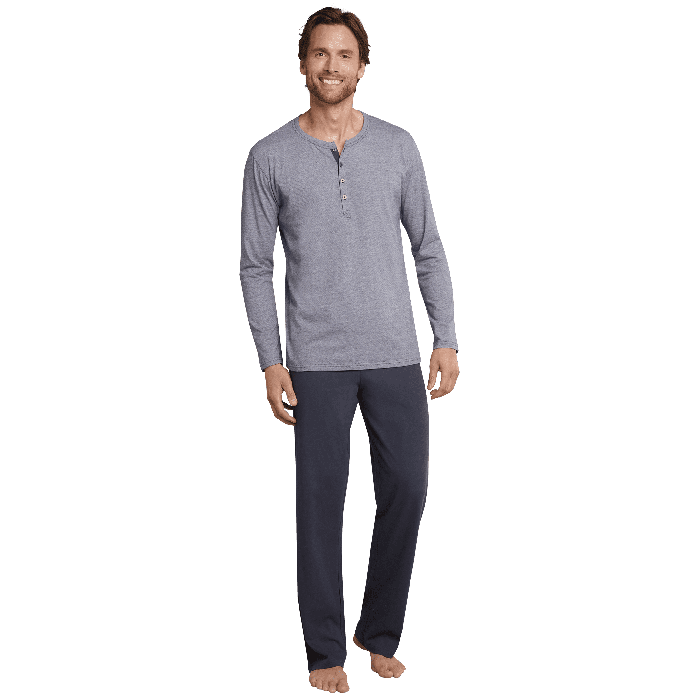 Een sportieve grijze heren pyjama van Schiesser met lange mouwen. Het pyjamashirt is licht grijs met knoopjes onder de ronde hals. De pyjamabroek is donkerder grijs en heeft rechte pijpen.