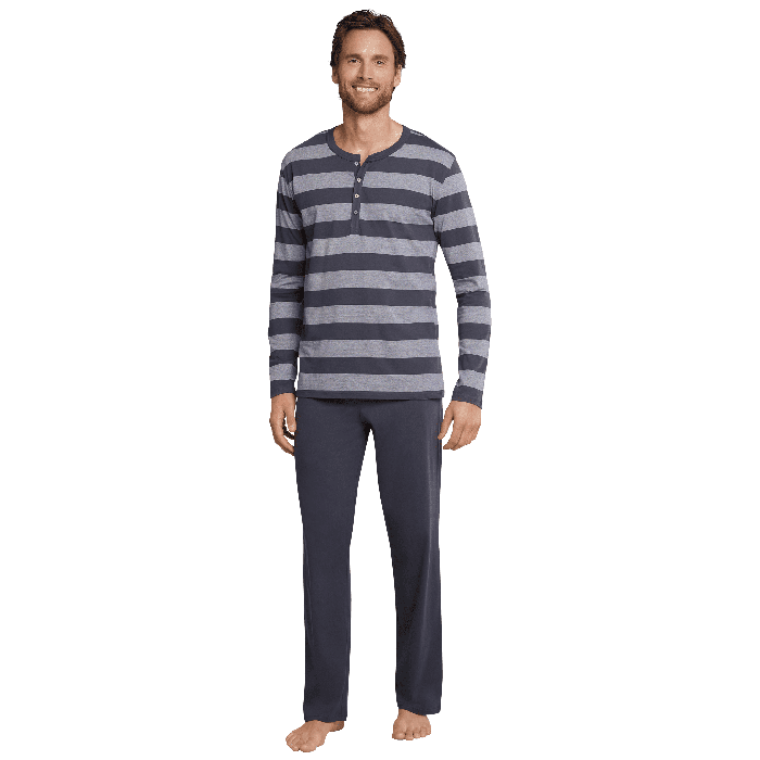 Een sportieve grijze heren pyjama van Schiesser met lange mouwen. Het pyjamashirt is licht grijs met donker grijs gestreept met knoopjes onder de ronde hals. De pyjamabroek is donkerder grijs en heeft rechte pijpen.