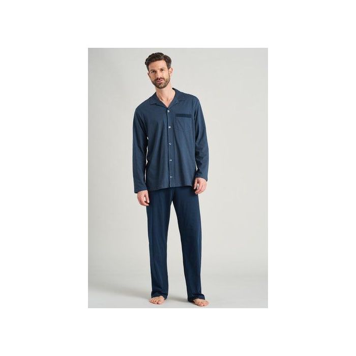 Een modieus blauw ruitdessin maakt van deze lange, jeansblauwe herenpyjama een blikvanger. Dankzij het zachte single jersey uit 100% katoen is deze tweedelige pyjama bijzonder comfortabel. De geruite top met klassieke kraag, een knoopsluiting en opgestikte borstzak is de perfecte aanvulling op de eenvoudige broek.