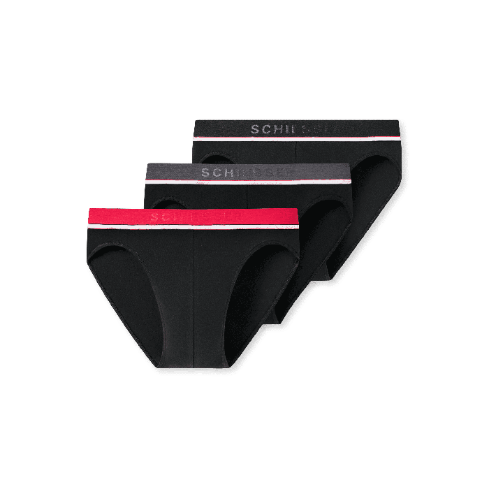zwarte rioslip voor heren in een praktische 3-pack met tailleband in rood, antraciet en zwarte, uit de populaire SCHIESSER-serie "95/5", met een sportief geweven elastische band met een smalle witte sierlijn, comfortabele pijpjes, aangenaam zacht en vormvast dankzij 95% natuurlijke biologische katoen en 5% elastaan, van een perfect zittende, elastische single jersey kwaliteit