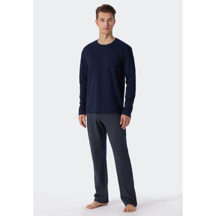 Een sportieve grijze heren pyjama van Schiesser met lange mouwen. Het pyjama shirt is effen blauw en heeft een ronde hals. De pyjamabroek van de blauwe heren pyjama het een stippenpatroon en rechte pijpen.